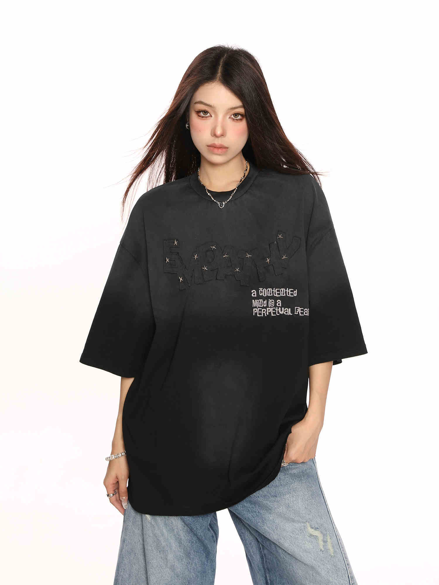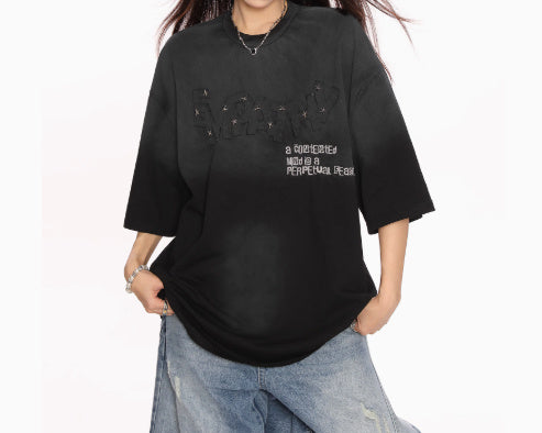 American Retro Distressed Gradient Rivet Letter Short Sleeve