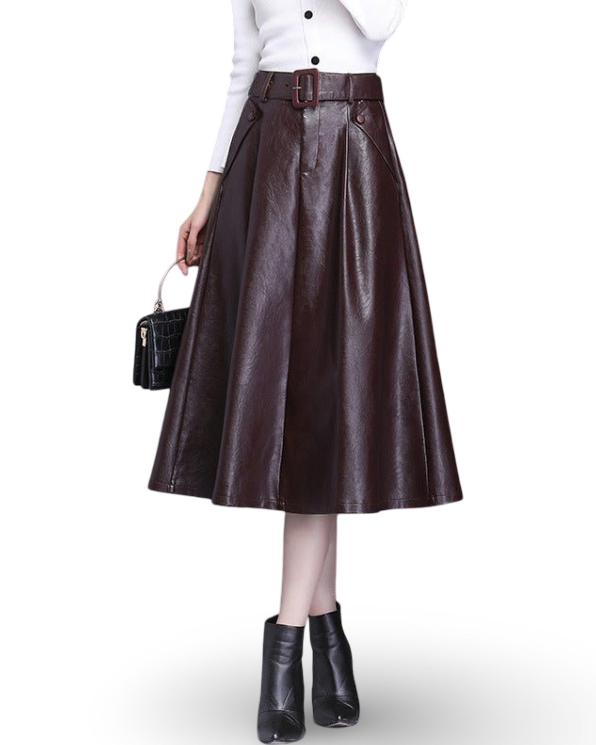 Autumn And Winter A Line PU High Waist Pleated Leather Leather Skirt