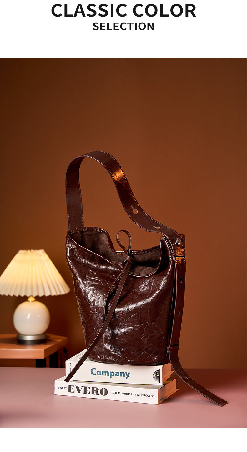 Crinkled Cowhide Bucket Shoulder Bag