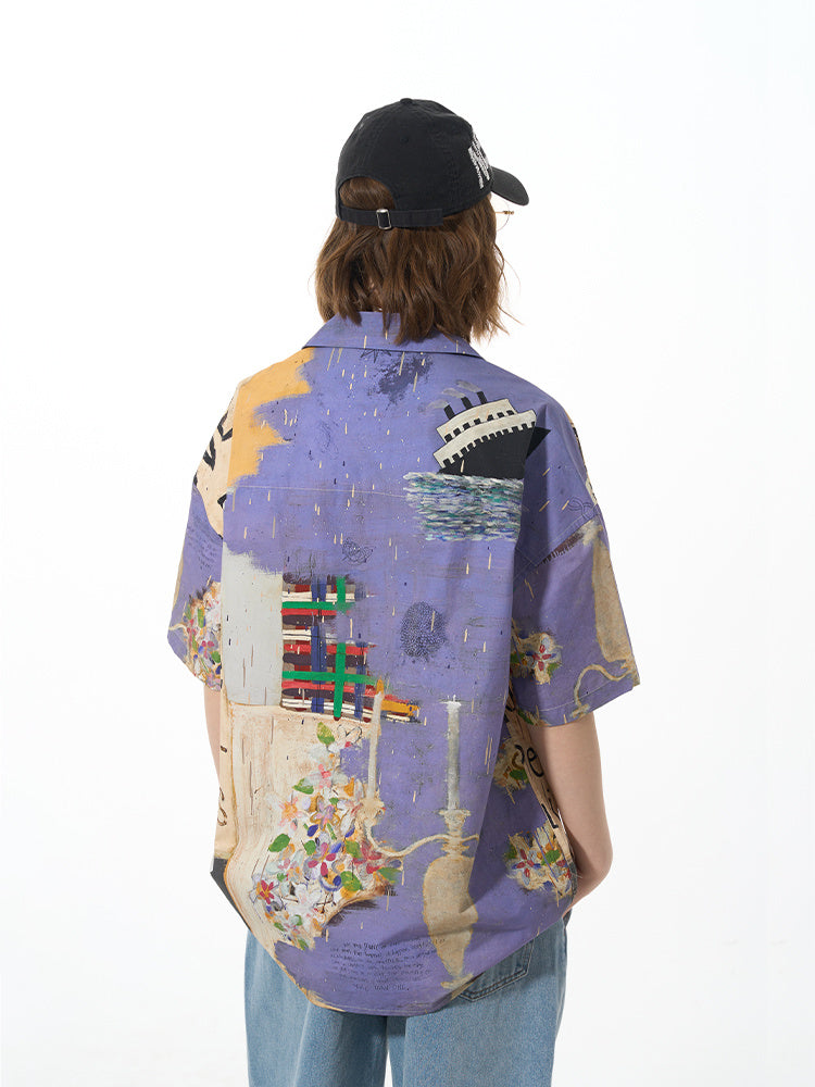Casual Loose Blue And Purple Cruise All Match Trend Short Sleeved Shirt
