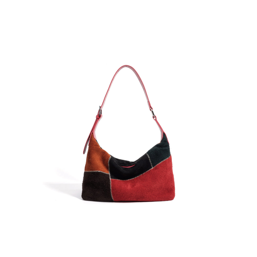 This shoulder bag is constructed from first-layer cowhide leather, cut into suede panels and assembled through controlled patchwork construction. Each panel is selected from the top hide layer to maintain fiber strength, not surface softness alone.