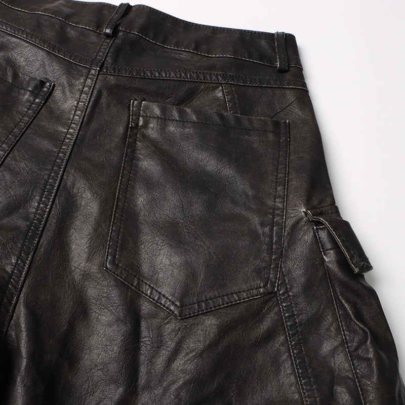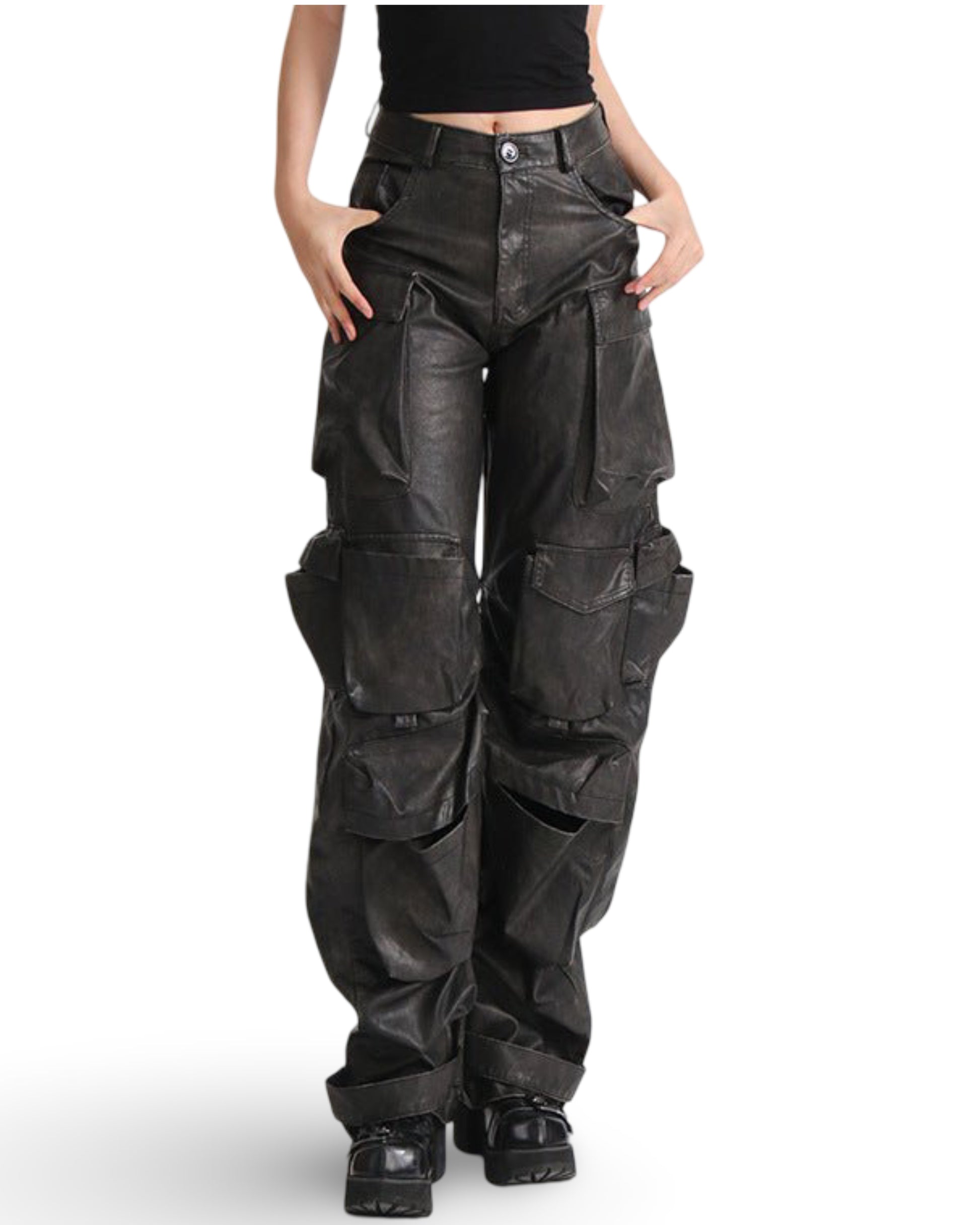 Fashion Unique Design Pocket High Waist Wide Leg Solid Color American PU Overalls