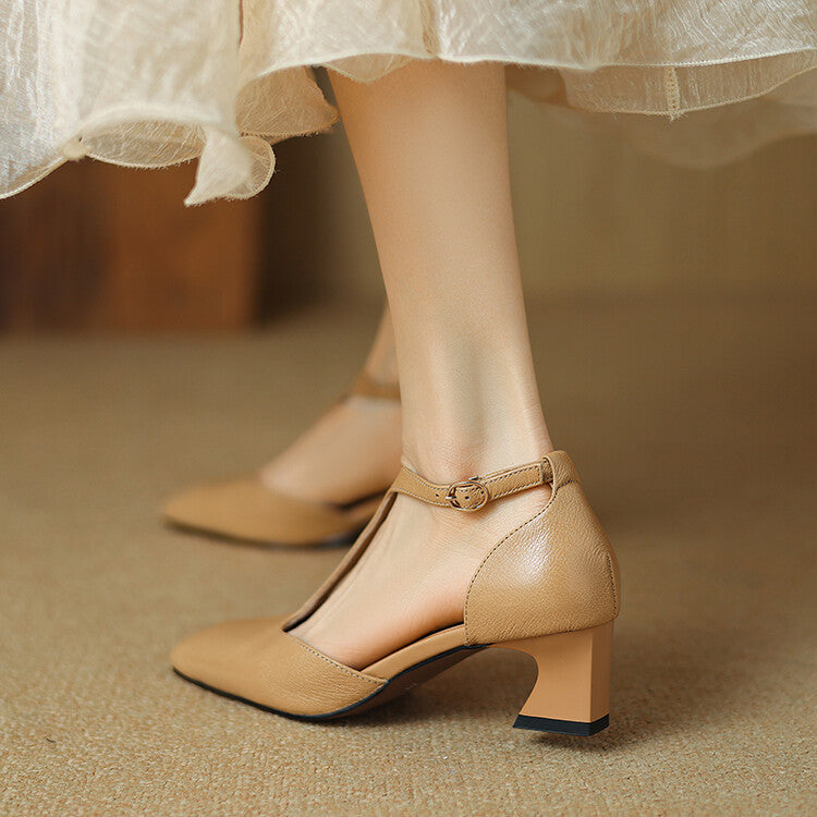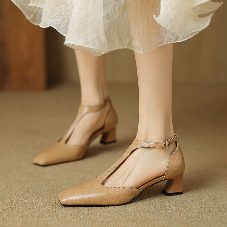 French Retro Square Toe Chunky Heel Wine Red Sheepskin Leather Shoes