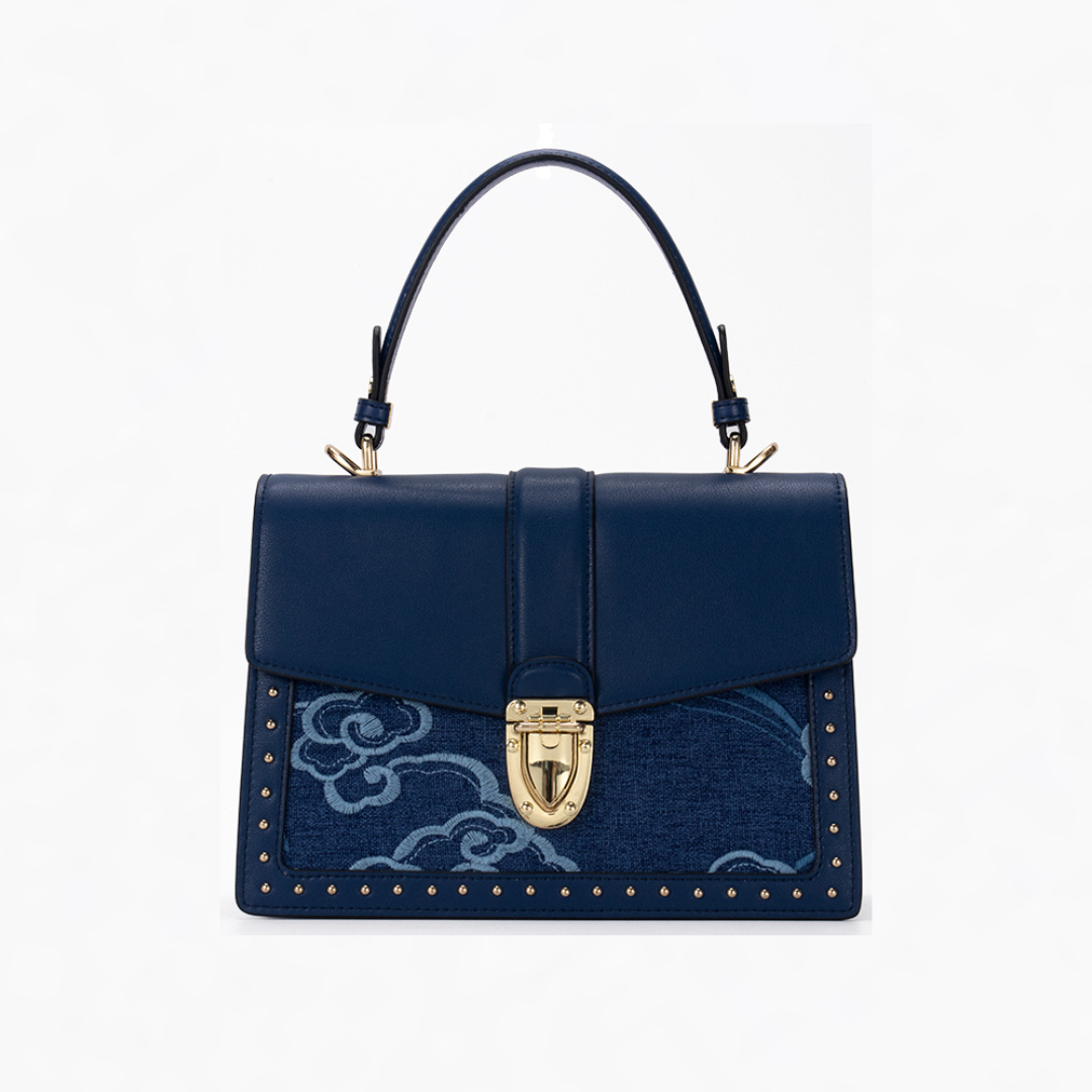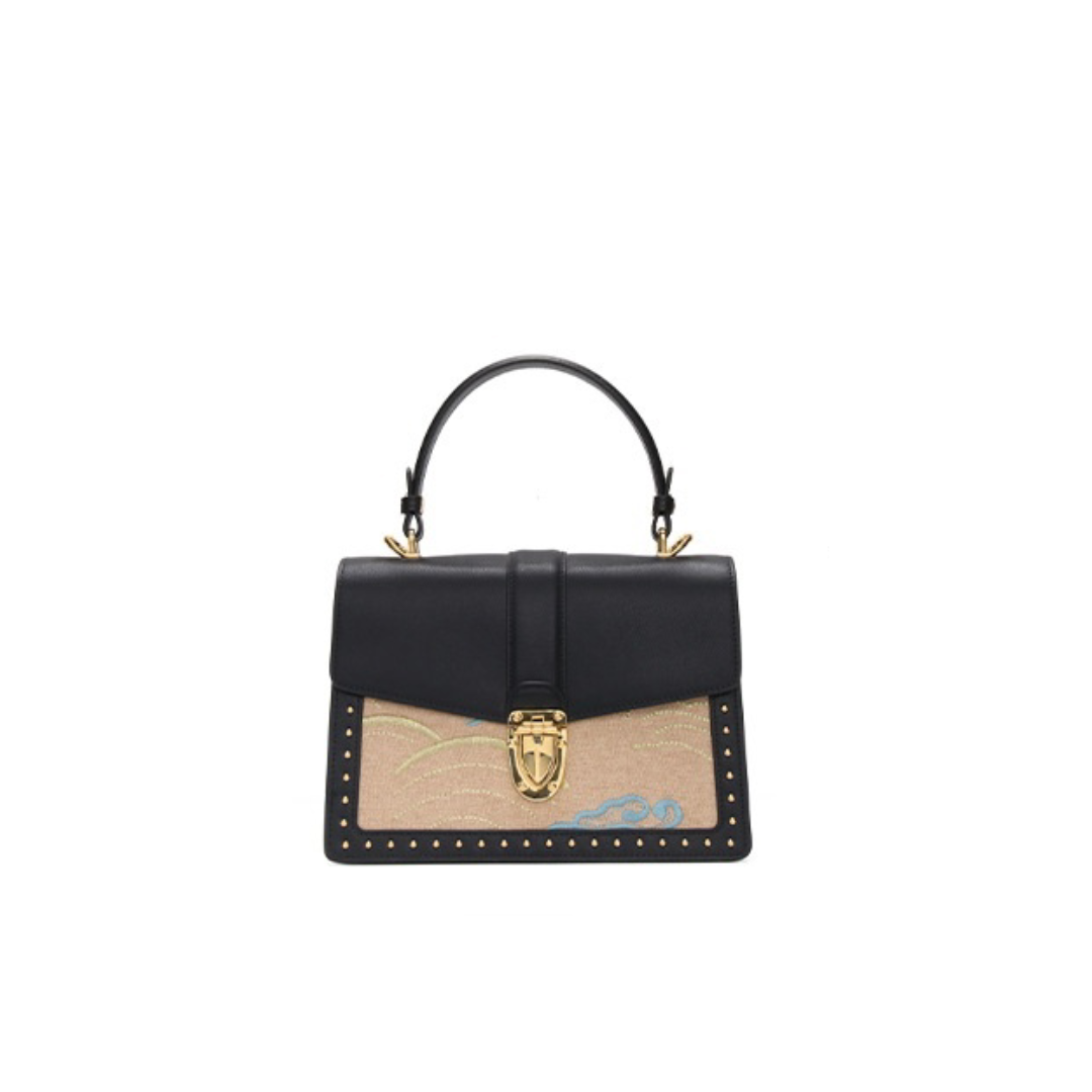 The body stays quiet so the front panel can speak—without overwhelming the structure. The studs draw a boundary. The clasp draws focus. The handle stays rigid so the bag keeps posture even when empty.