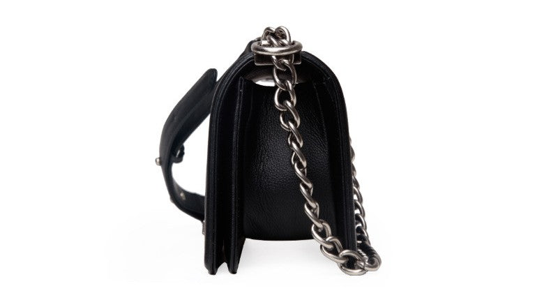 The metal chain strap is weight-bearing. The leather shoulder section is added not for comfort marketing, but to prevent long-term strap bite and edge cracking where chains usually fail.