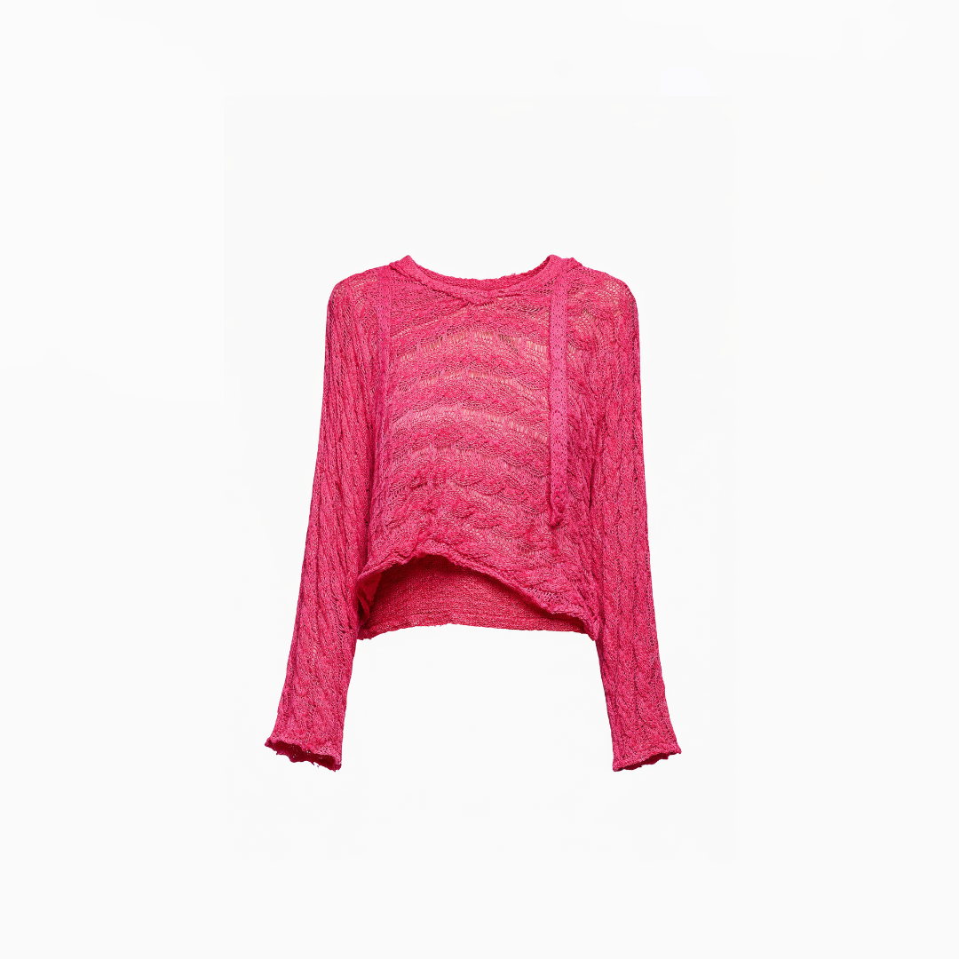 The pink tone isn’t soft or cute — it’s bold, artistic, and deliberate. The loose weave creates depth and airflow, while the cropped length sharpens the silhouette instead of weakening it.