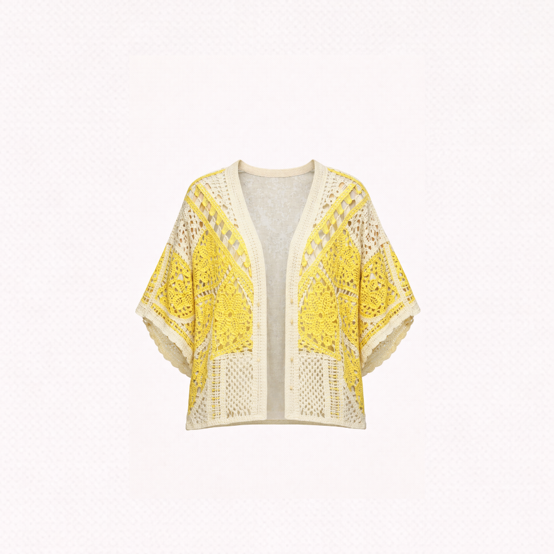 An open-front crochet layer built to carry light, color, and structure together.