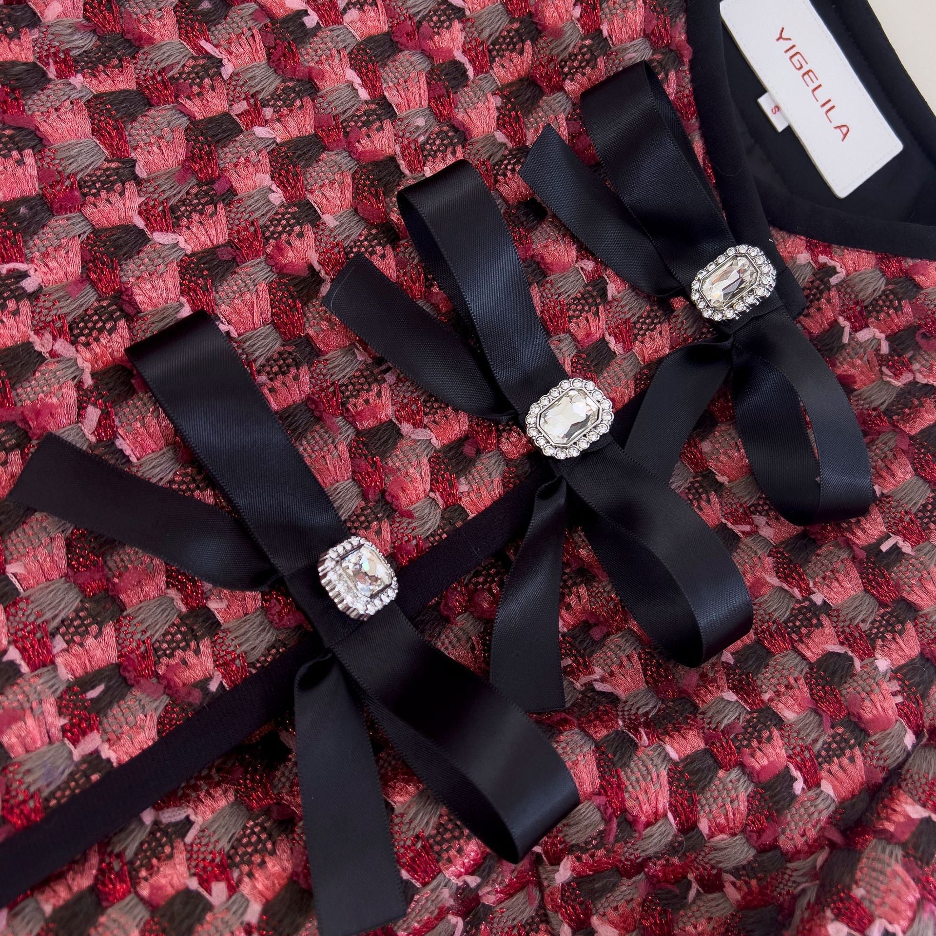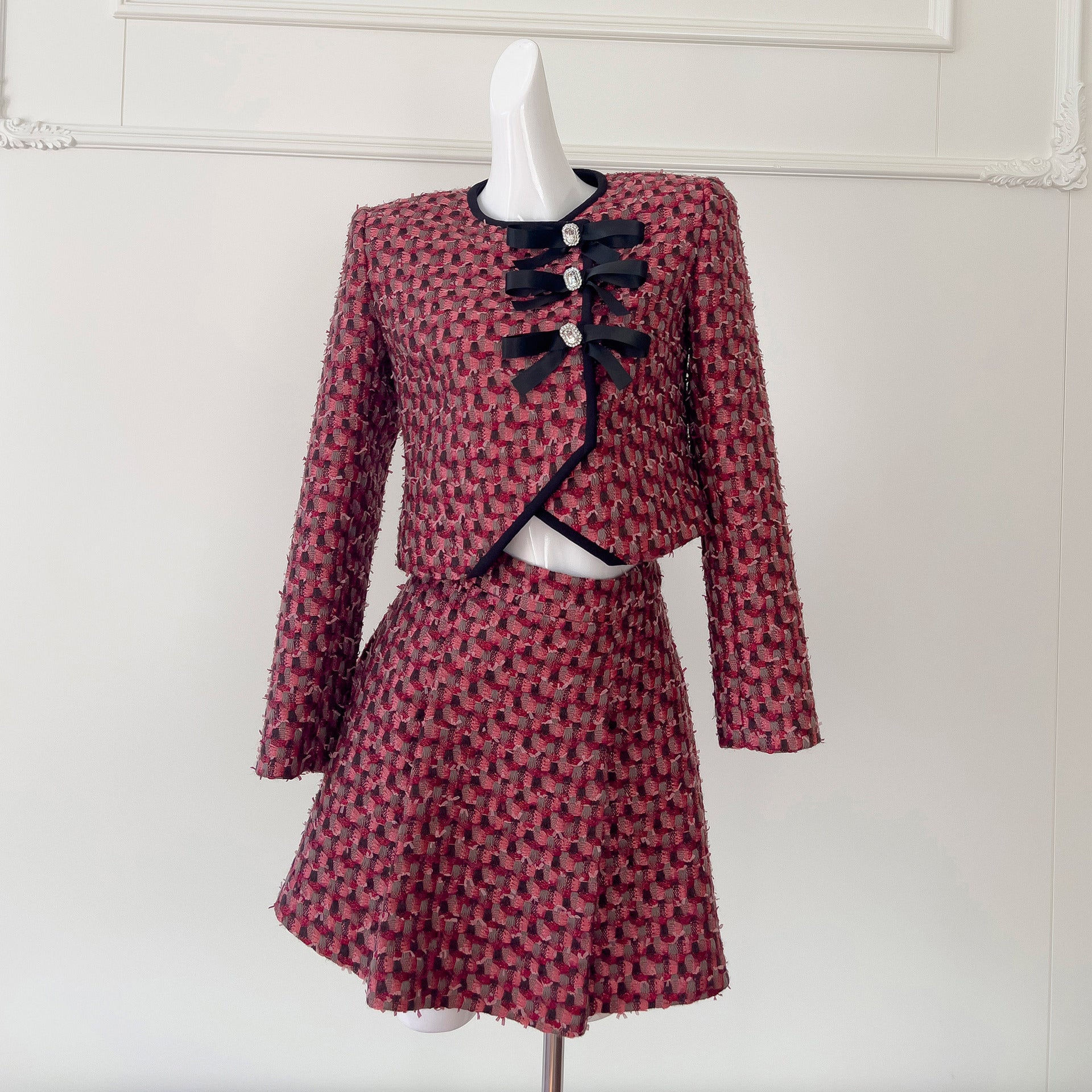 Red Tweed Long Sleeve Top Coat With Short Skirt
