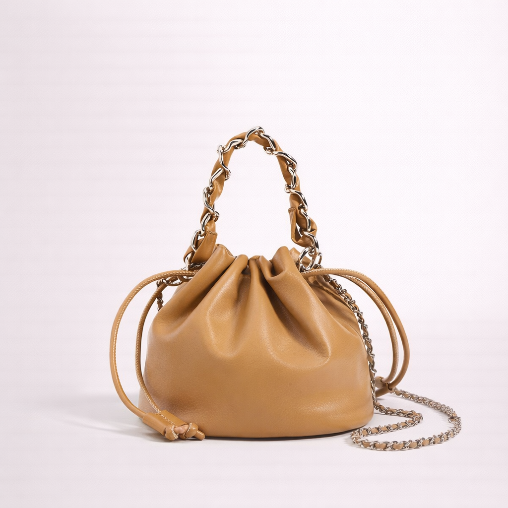 Chain-Handle Drawstring Bag — First-Layer Cowhide Leather