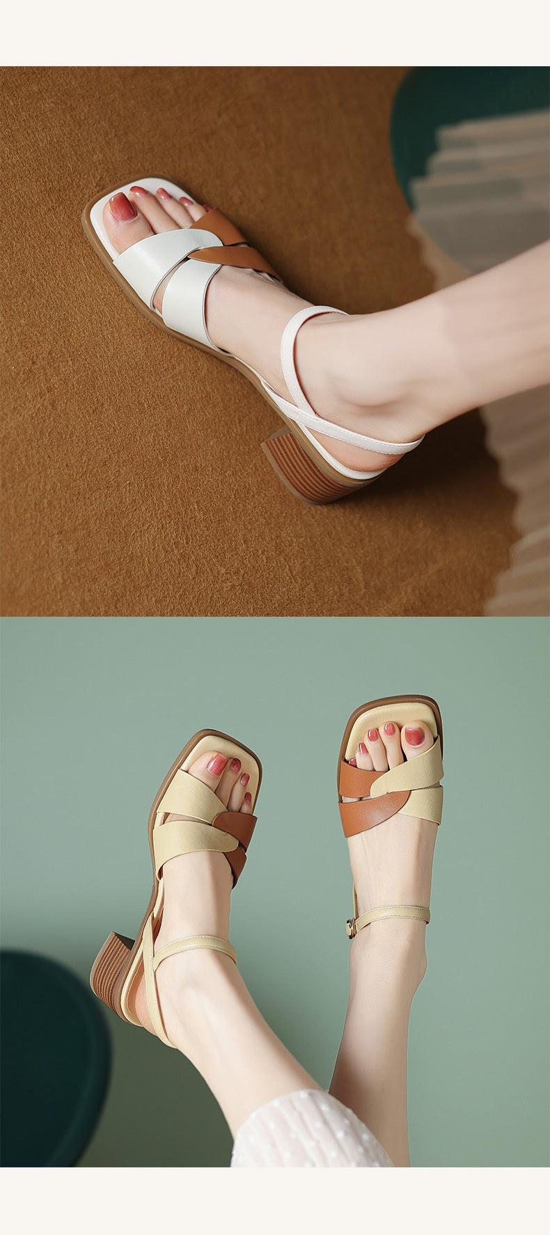 First-Layer Cowhide Low-Heel Sandal – Dual Strap Structure