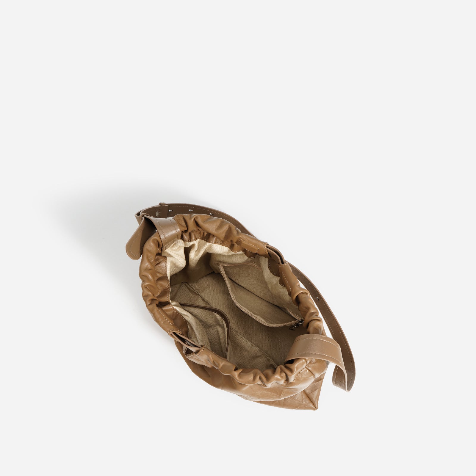 The pouch form is intentionally uninterrupted — no external panels, no forced angles. The leather body gathers at the top opening in a measured way, allowing movement without collapsing into disorder. The base is subtly stabilized so the bag rests without tipping, even when partially filled.