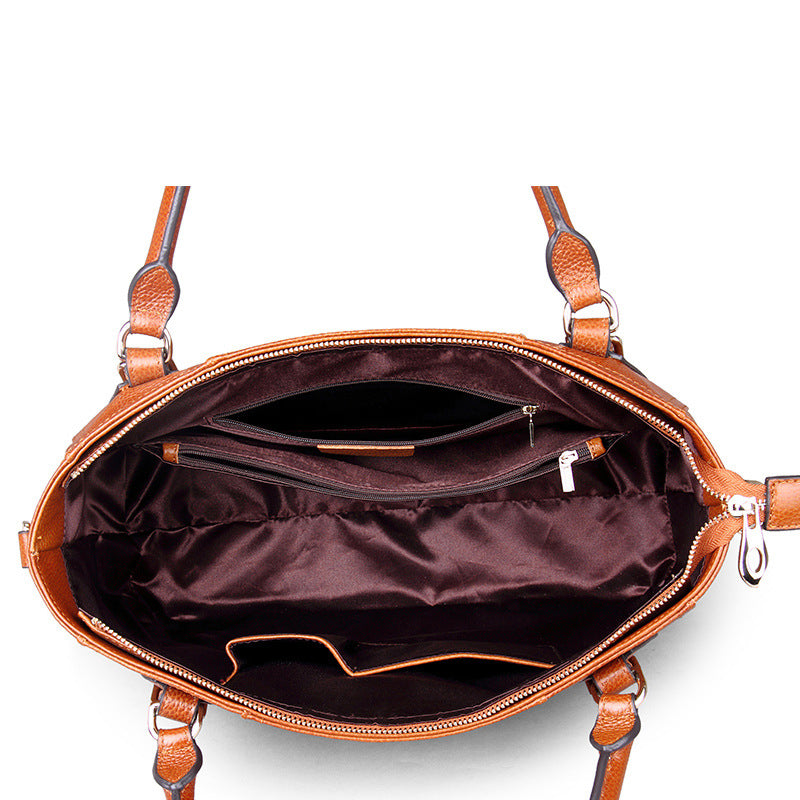 Handles are built from layered cowhide with reinforced anchor points. Stress zones are stitched through multiple layers to prevent stretching or tearing over time. The handle drop is calculated to sit comfortably on the shoulder without forcing the bag to tilt outward.