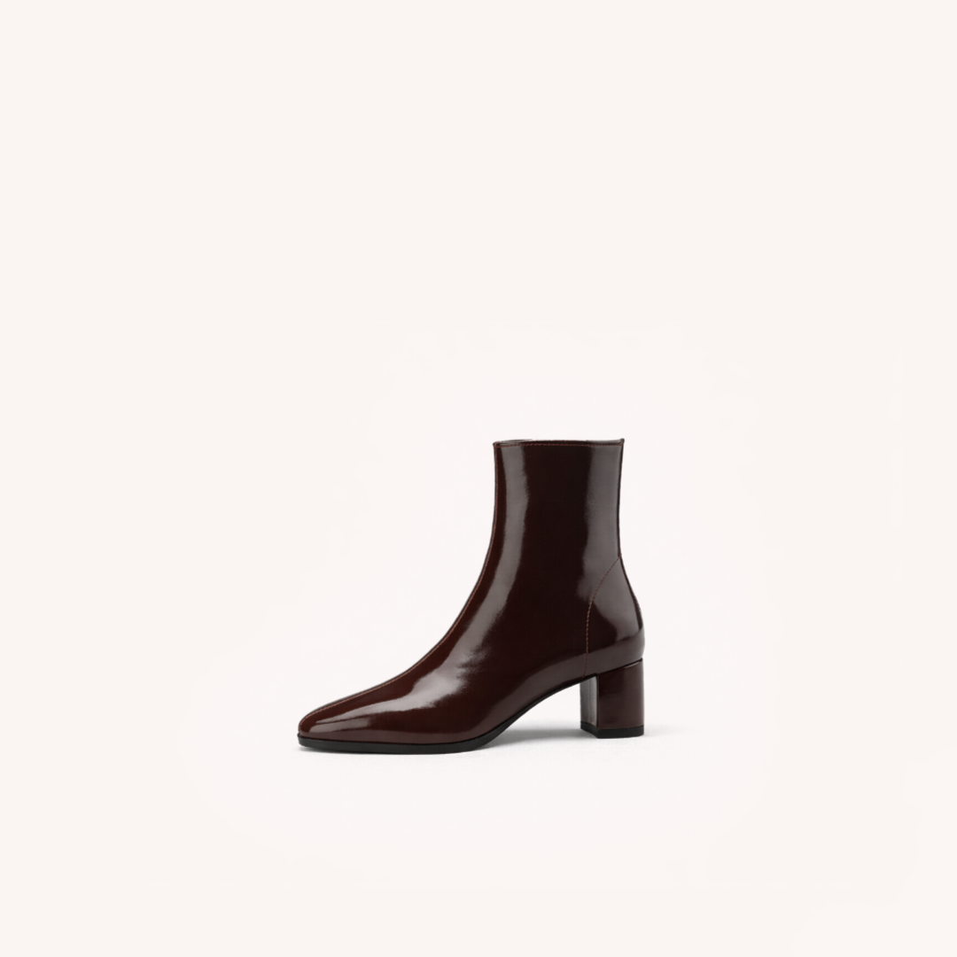 The silhouette is clean and uninterrupted, designed to sit close to the ankle without excess bulk. A stable mid-height block heel supports even weight distribution and consistent ground contact, making the boot suitable for extended wear rather than short appearances.